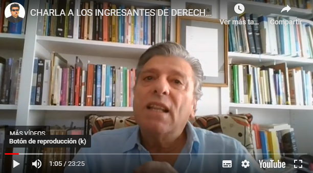 Desde 2016, en el mes de marzo, la UDE (Universidad del Este) me invita a participar del curso de ingreso de la carrera de Abogacía. La idea es que alguien poseedor de otro título de grado pueda transmitir su experiencia a quienes comienzan sus estudios. La pandemia que nos afecta a todos hizo que mi charla, esta vez, fuera a través de un video subido a YouTube. No deja de ser un situación algo particular, hablarles, darles mi parecer, a quienes serán mis condiscípulos, jóvenes con los que es posible incluso que me toque compartir todavía alguna cursada.