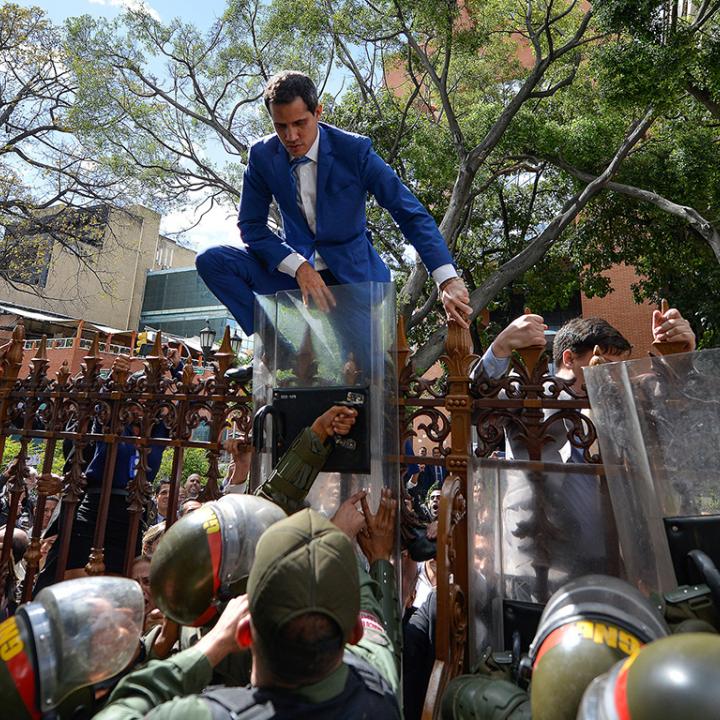 En ese popurrí de imágenes que poco ayudan a la tranquilidad, esa que uno estima necesaria cuando ha llegado la hora de irnos a dormir, nos llama la atención, nos impacta, a mí y a Kiki, una secuencia breve. Muestra a Juan Guaidó, enfundado en un impecable ambo entre azul y celeste, mientras trepa e intenta sortear, de manera muy ágil aunque muy temeraria, las peligrosas rejas del palacio. Contemplar como balancea su humanidad sobre una intimidante lanceta de hierro (así se ve la punta en la que remata esa estructura) exponiendo sus dos más caros atributos a milímetros de dejarlos colgados, nos deja muy muy impresionados.
